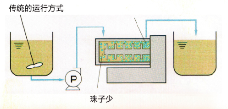 傳統磨機的運行方式 1、粒度難以控制,分散不充分; 2、粒度分布往往較寬; 3、無法控制物料的溫度; 4、在大流量高速運轉時,磨介易聚集在腔體一側,容易堵塞在出料口。 |